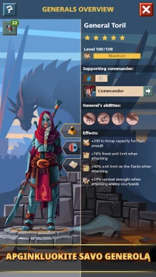Pergalė mūšio lauke priklauso ne tik nuo kariuomenės dydžio, bet ir nuo jūsų strateginio meistriškumo. Atrakinkite unikalius generolus ir išnaudokite jų specifinius gebėjimus, kad pergudrautumėte savo priešininkus. Kiekvienas žingsnis turi būti apgalvotas, kiekviena kova – kruopščiai suplanuota. Suburkite narsiausių riterių, ietinininkų ir lankininkų armiją, apmokykite negailestingus karius ir siųskite juos į lemiamus mūšius užkariauti keturių karalysčių žemes. Nepamirškite ir savo gynybos – strateginė pilies apsauga atgrasys net ir stipriausius priešus.